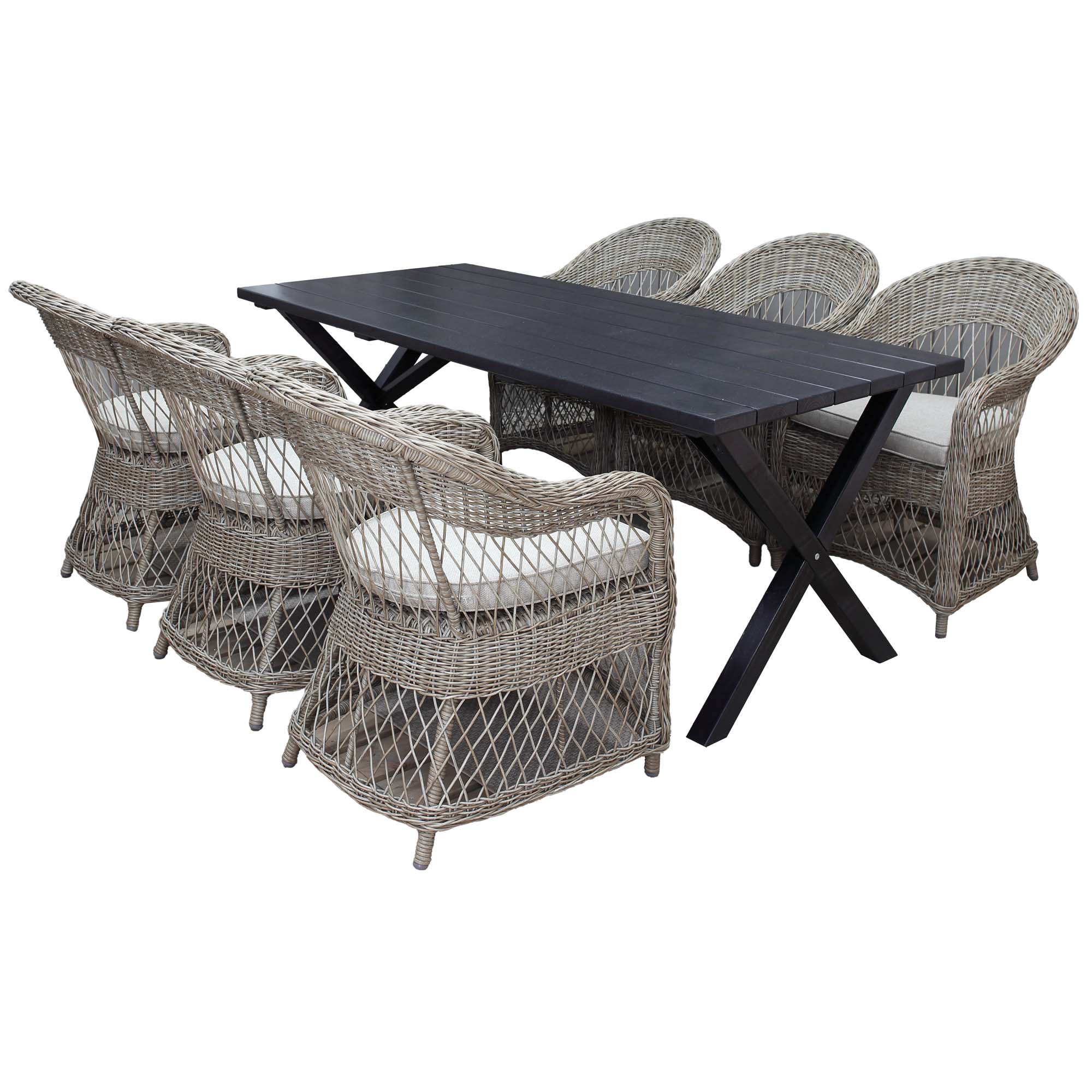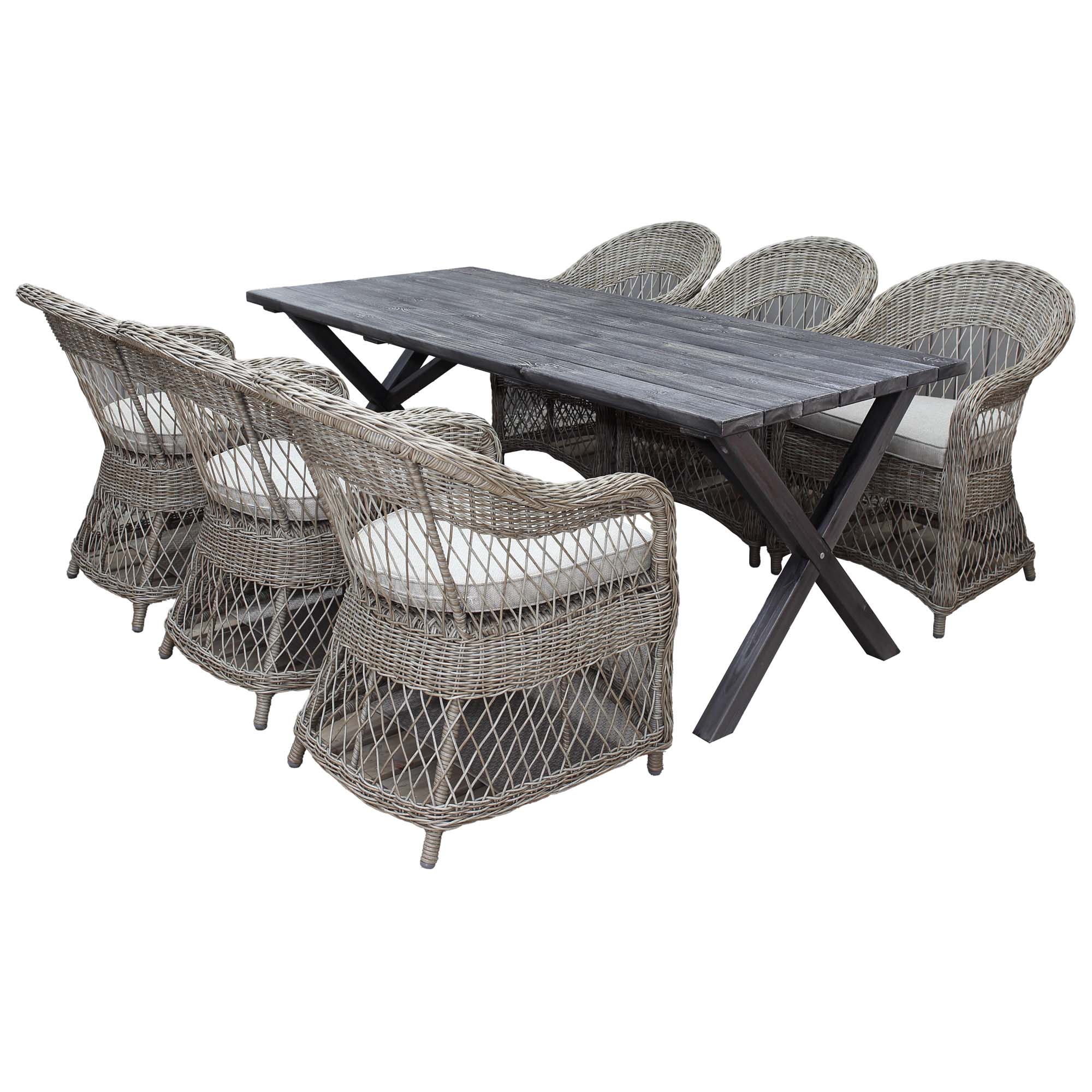 Modern trädgårdsmöbelgrupp med rektangulärt bord i massivt trä med kryssben och 6 klassiska rottingfåtöljer. Rymmer bekvämt 6 personer och passar utmärkt för uteplats, altan eller trädgård.