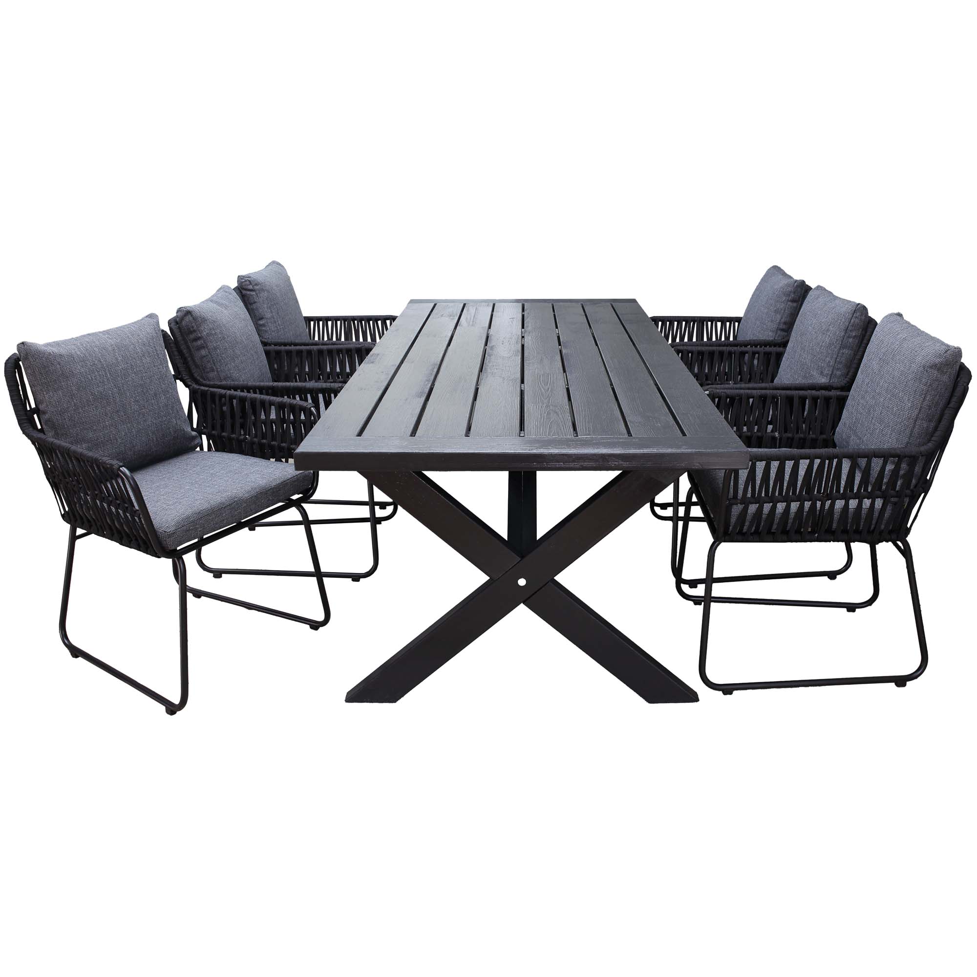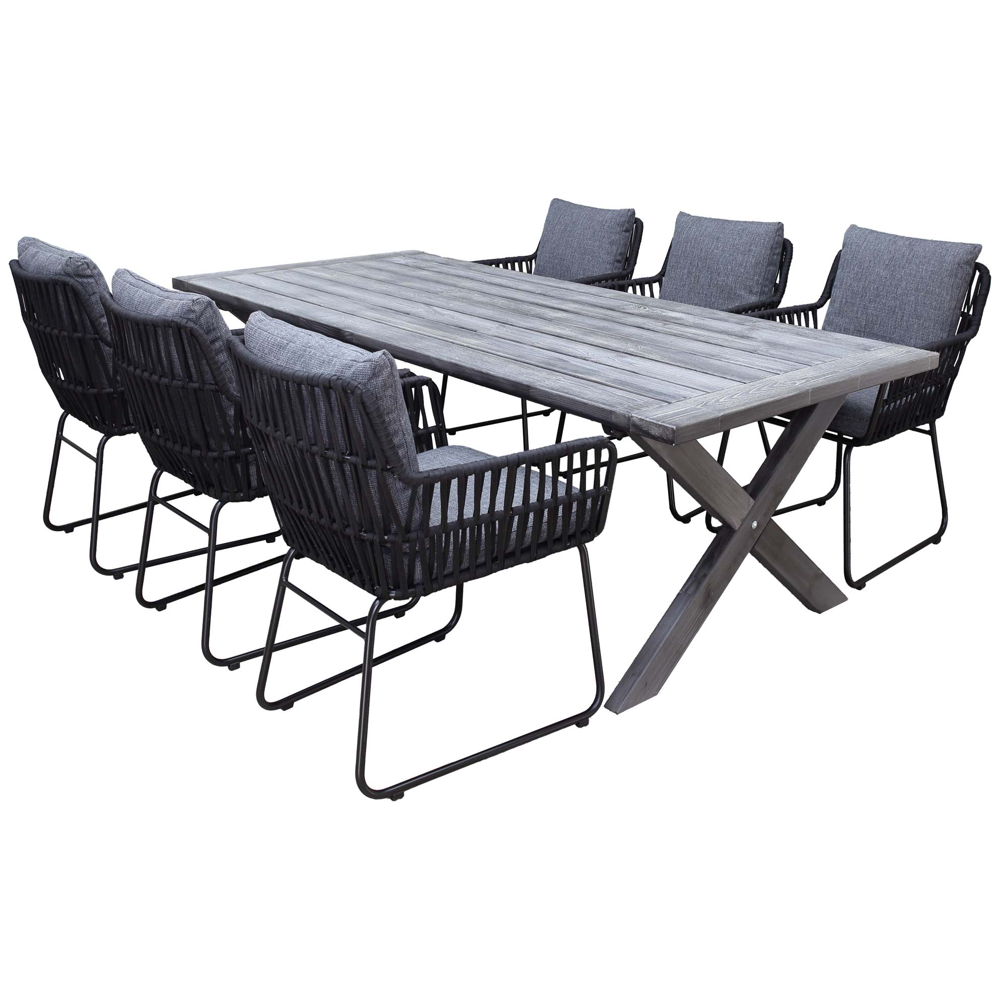 Modern trädgårdsmöbelgrupp med rektangulärt massivt träbord med kryssben och 6 bekväma, rymliga repfåtöljer. Gott om plats för 6 personer – perfekt för uteplats eller trädgård.