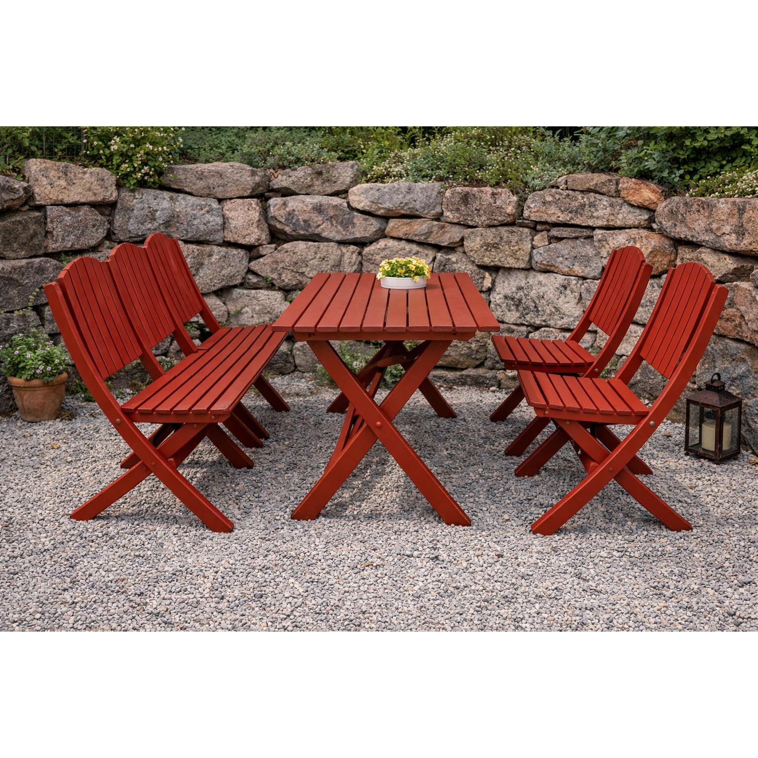 Stolar, bänk och bord är hopfällbara vilket ger enkel vinterförvaring och smidig hantering när utrymmet är begränsat. Samtliga delar tillverkas av FSC®-certifierad norrländsk kärnfuru – ett starkt och naturligt material som åldras vackert och klarar många års användning.