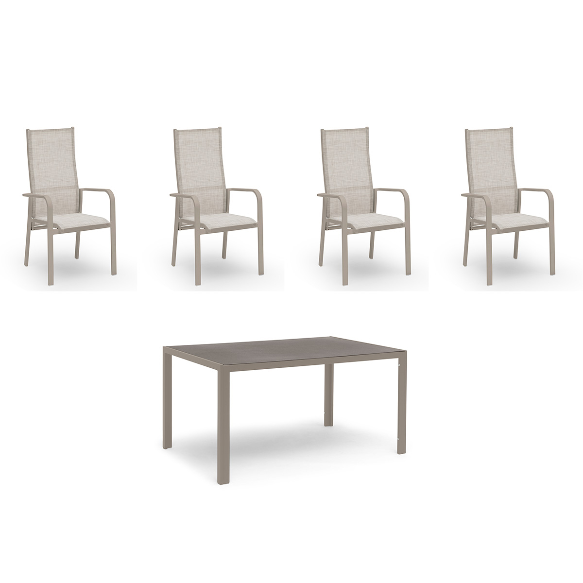 Stilrent och underhållsfritt allroundbord som passar till många olika stolar. Tillverkad i aluminium. Bordsskiva i varmgrå melerad keramisk glas, 5 mm tjock. Till bordet är det 4st av Hillerstorps mest säljbara stolar. Underhållsfri positionsstol som med sin lätthet i designen skapar ett stilrent och modernt uttryck. Tillverkad i aluminium med sits- och rygg i textilene. Stolen är ställbar i olika lägen samt stapelbar.