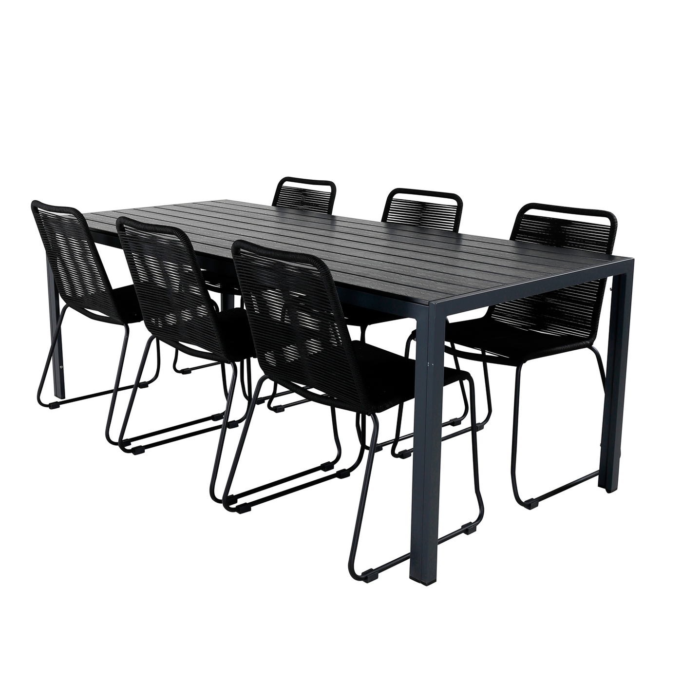 Matgrupp från Venture Home. Samla ihop dina vänner och njut tillsammans av en solig dag i trädgården runt denna matgrupp. Matbordet Break har bordsben i aluminium och en bordsskiva i svart polywood. Matchas med 6 st Lindos stapelbara matstolar i svart stål. Enklare montering krävs.