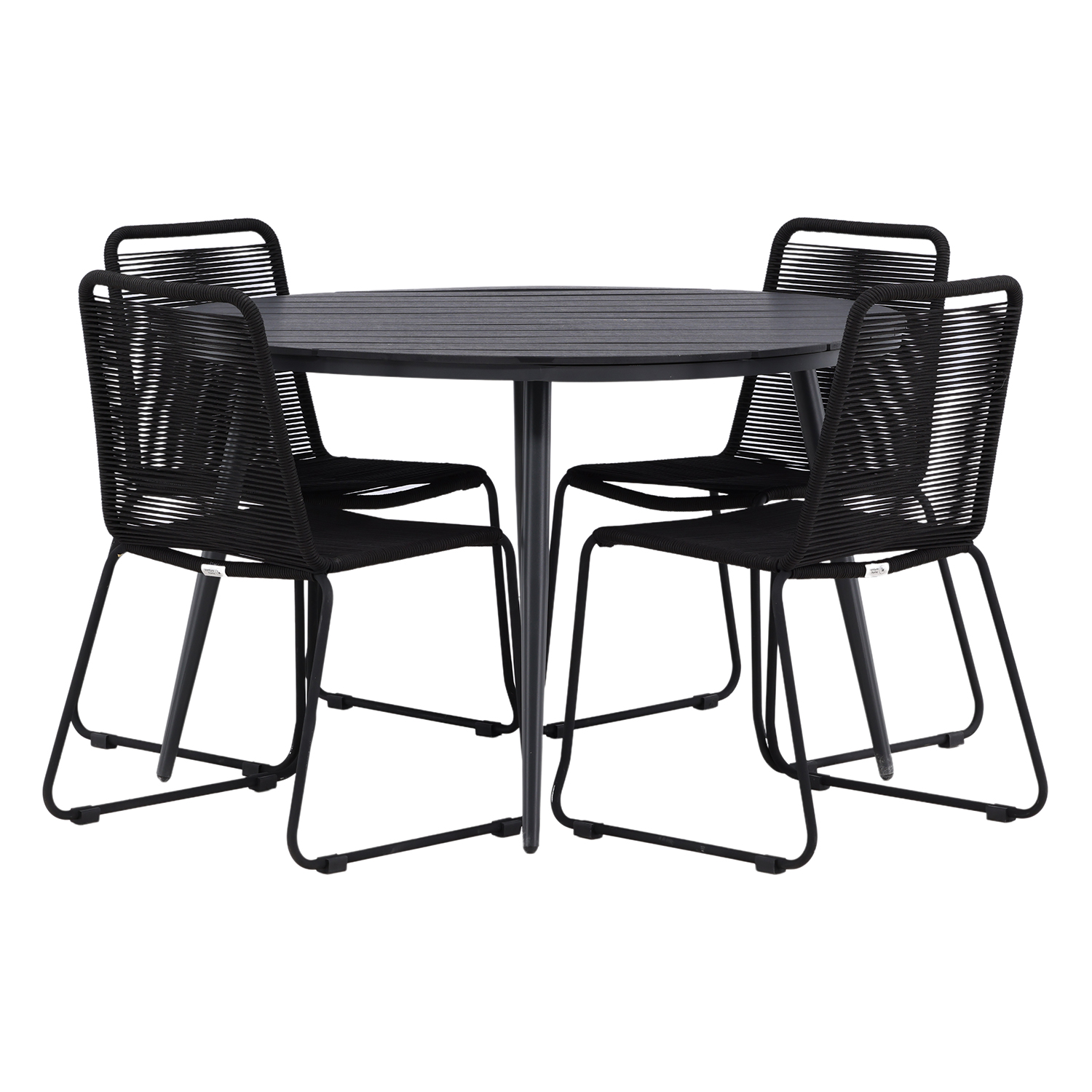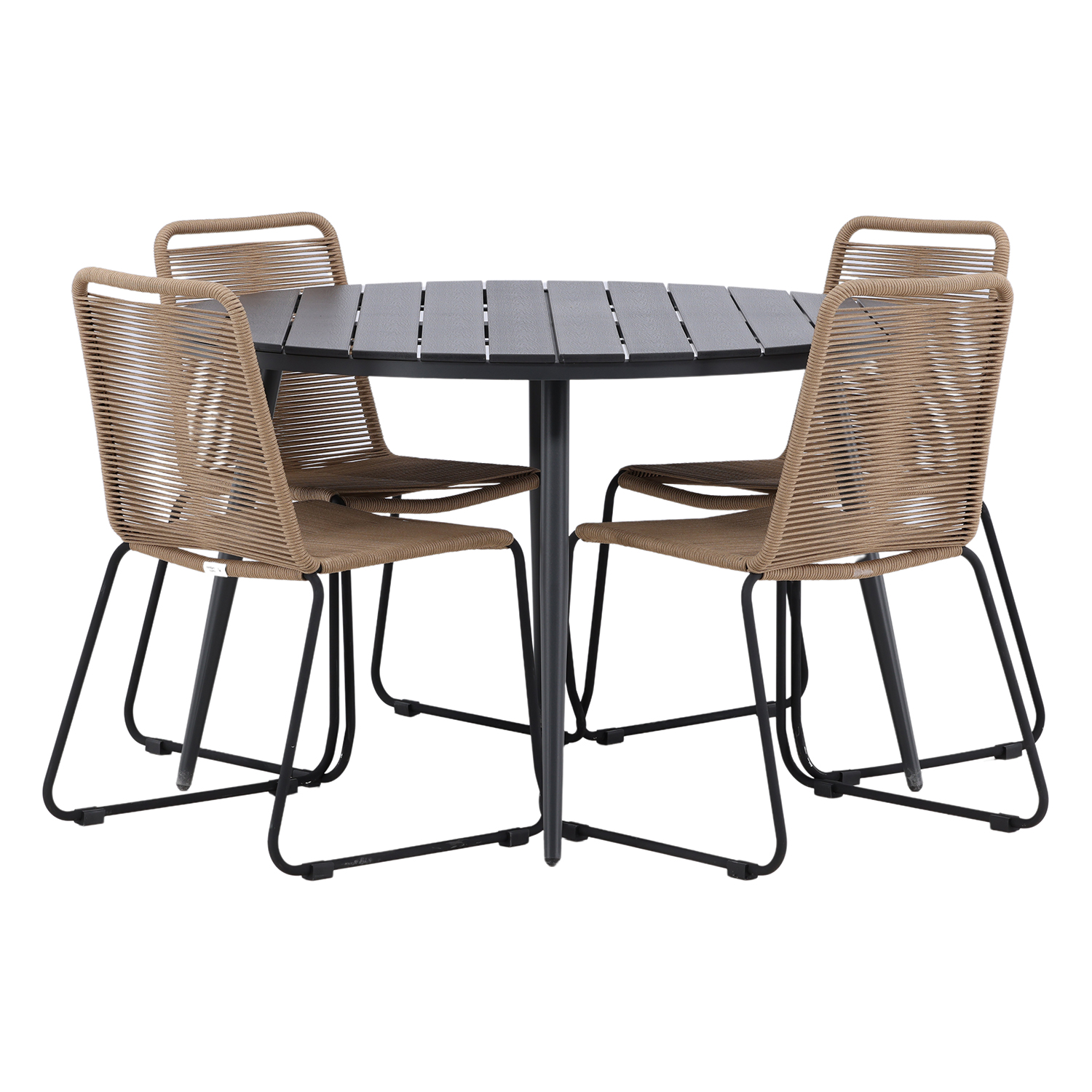 Matbord Break har en rund bordsskiva i aintwood och ett klassiskt underrede i aluminium. Här tillsammans med trendsäkra matstolar från serien Lindos i modemedveten design. Stolarna har stilrent smala ben i aluminium och en sits i slitstarkt rep. Möblera inbjudande på uteplatsen och skapa ett blickfång som imponerar.