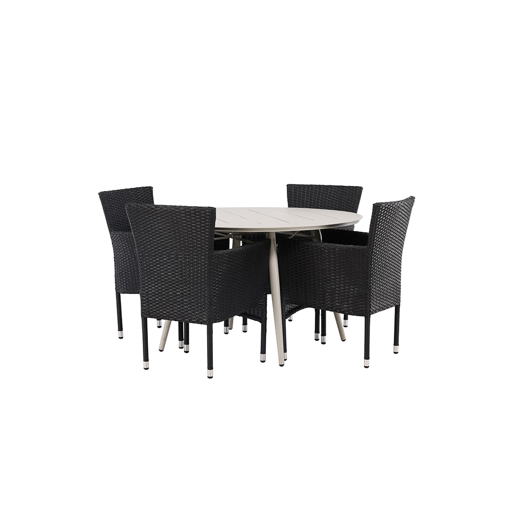 Sitt bekvämt och möblera inbjudande - här hamnar ingen på kanten! Det enkla men eleganta, runda matbordet från serien Lina har en fräsch design. Toppskivan är tunn med dekorativa springor och bordsbenen lätt utsvängda; genomgående tillverkat i stål. Här tillsammans med 4st av våra bekväma matstolar från serien Malina. Stolen har en stomme i aluminium och är klädd i korgflätad konstrotting. Den perfekta matgruppen för sommarens alla måltider! Bordets diameter: 120cm.