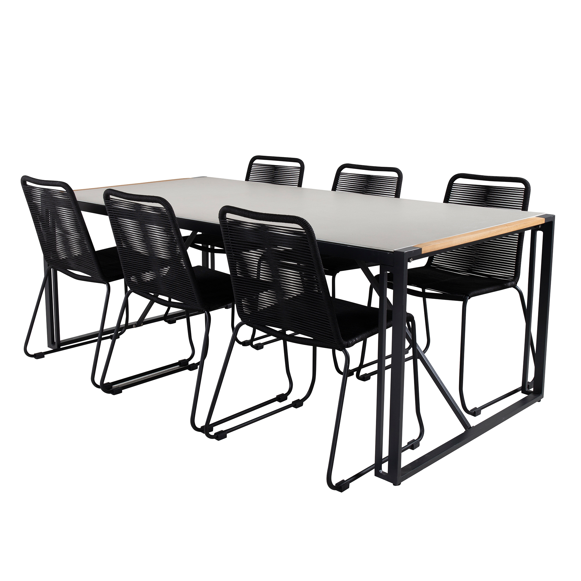 Skapa en härlig och inbjudande känsla i din trädgård med denna stilsäkra matgrupp. Matgrupp Texas med bordskiva i i glas och teak. Matgruppen kommer tillsammans med 6st Lindos matstolar med en ram i svart stål och en sits i rep.
