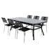 Matgrupp Vyn med ett matbord i svart stål och en grå bordsskiva. Matchas tillsammans med 6 st Lumi matstolar med en ram i svart aluminium och en sits i rep. Bord och stol kräver enklare montering.