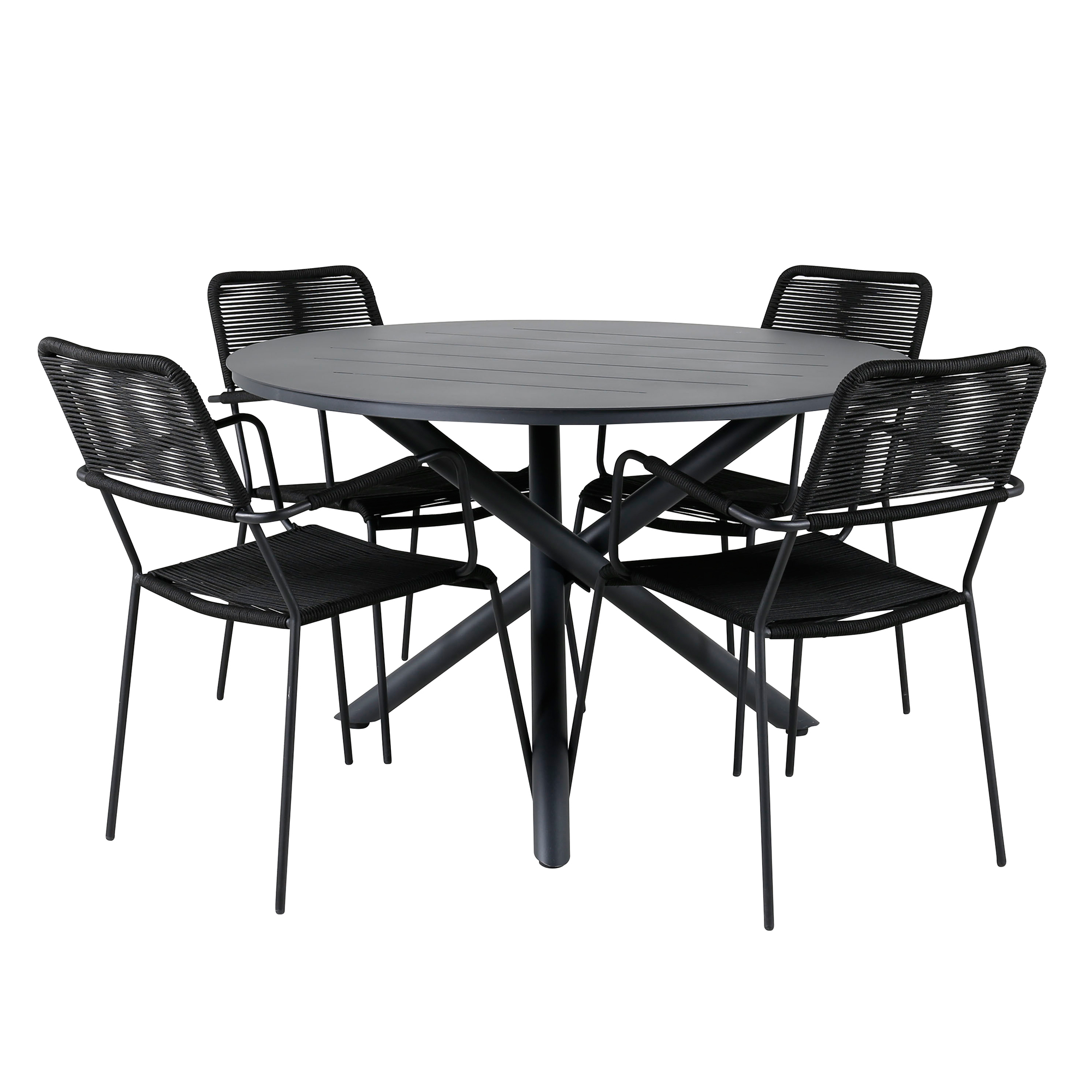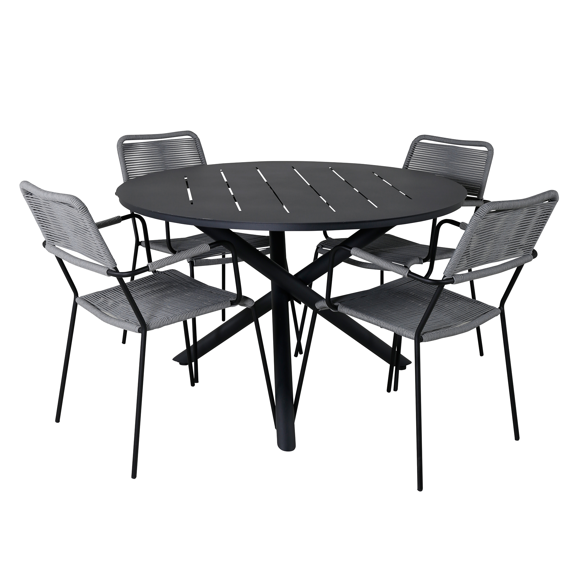 Matgrupp Ande från Venture Home. Matbord med en bordsskiva i aluminium. Matchas med 4 stycken Minos matstolar med stolsben i stål och sits i rep.