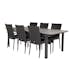 Matgrupp Venture Home Lova 224/324 med 6 Asta Stolar är en matgrupp för uteplats eller trädgård. Bordet är förlängningsbart och är tillverkat av aluminium med en bordsskiva i Aintwood. De medföljande sex stolarna är stapelbara och de är tillverkade av konstrotting. Gruppen kräver lättare montering.