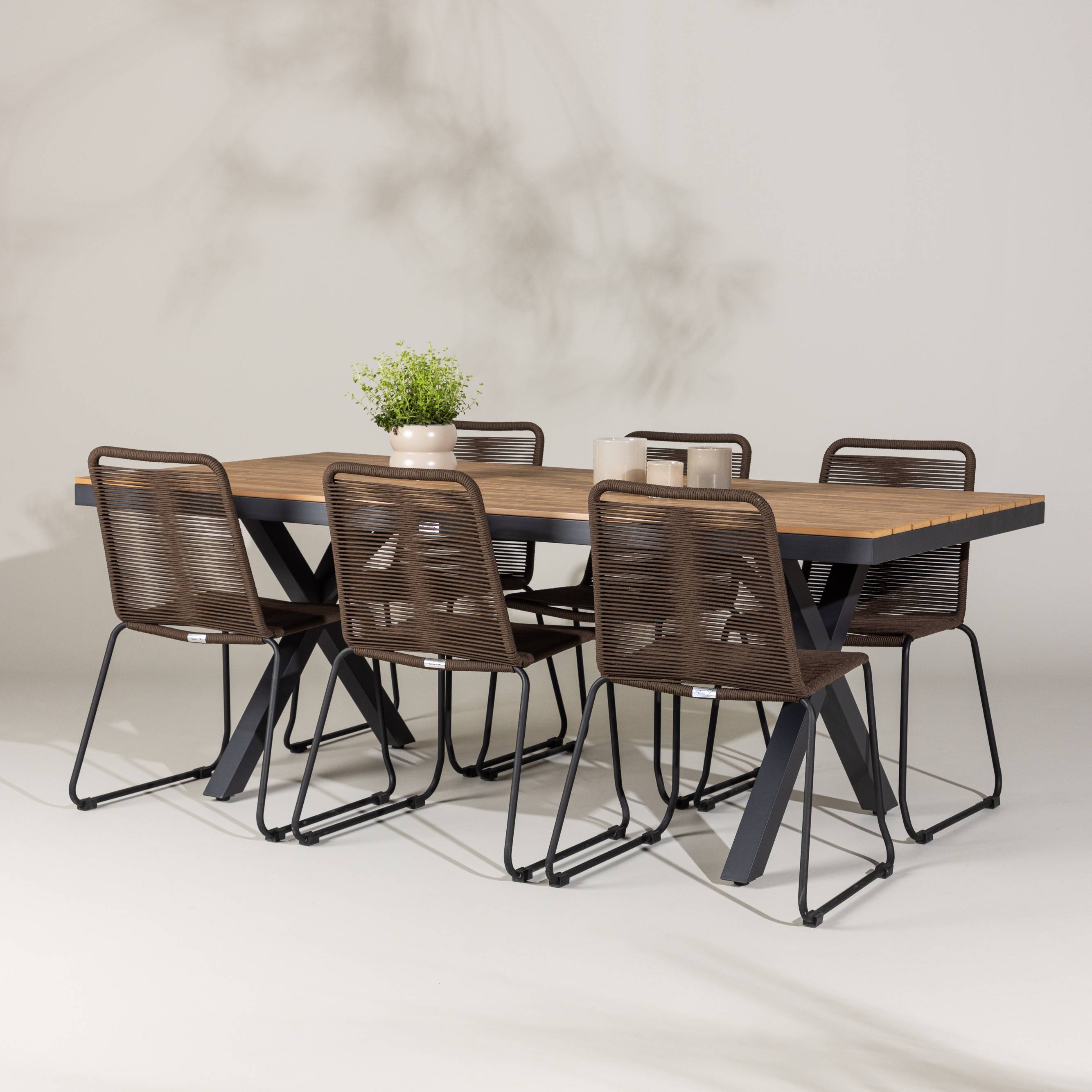 Stolarna Lindos är det ultimata komplementet till Garcia-bordet. Tillverkade med rep och stålben i en elegant färg, erbjuder dessa stolar både stil och komfort för din utomhusavkoppling. Med sex inkluderade stolar är denna matgrupp perfekt för att samla familj och vänner för minnesvärda stunder under öppen himmel.