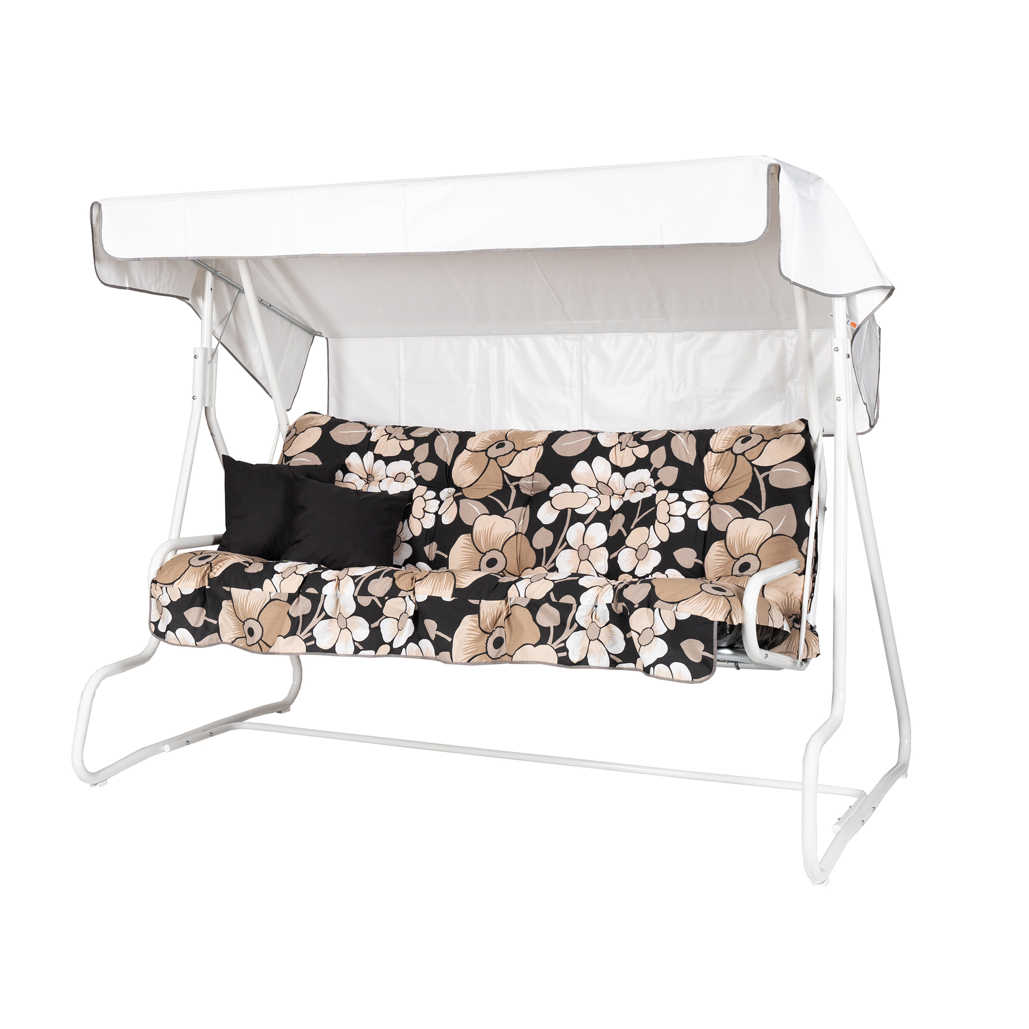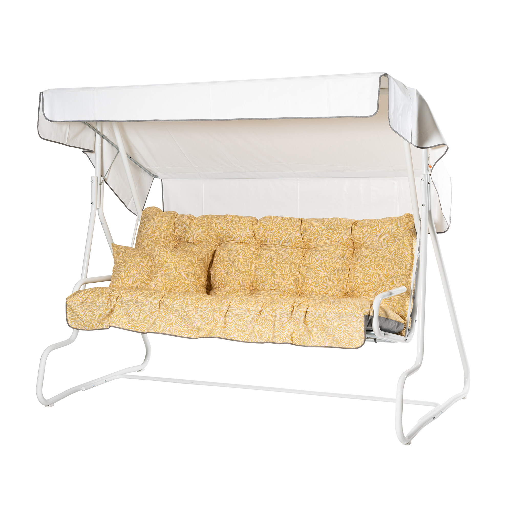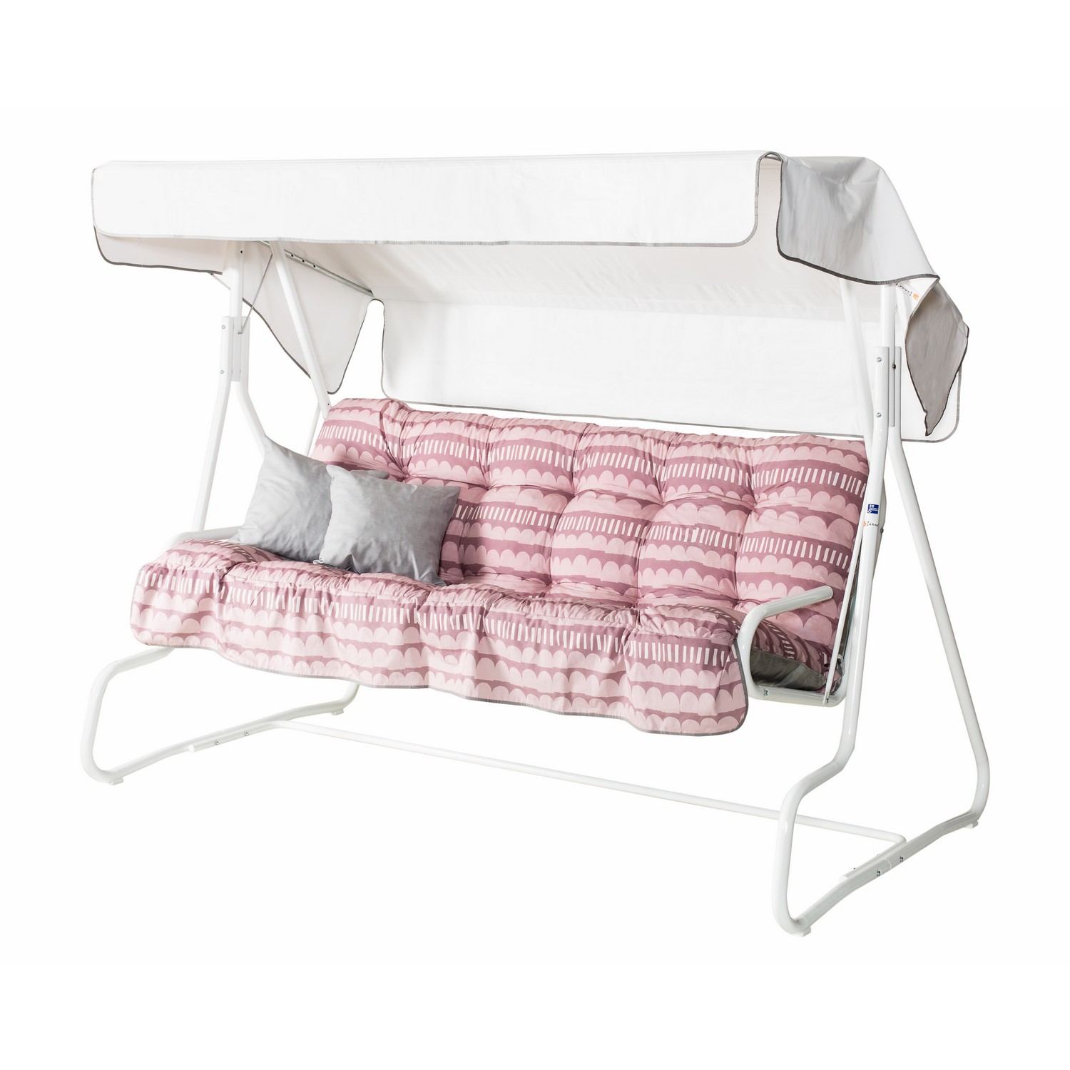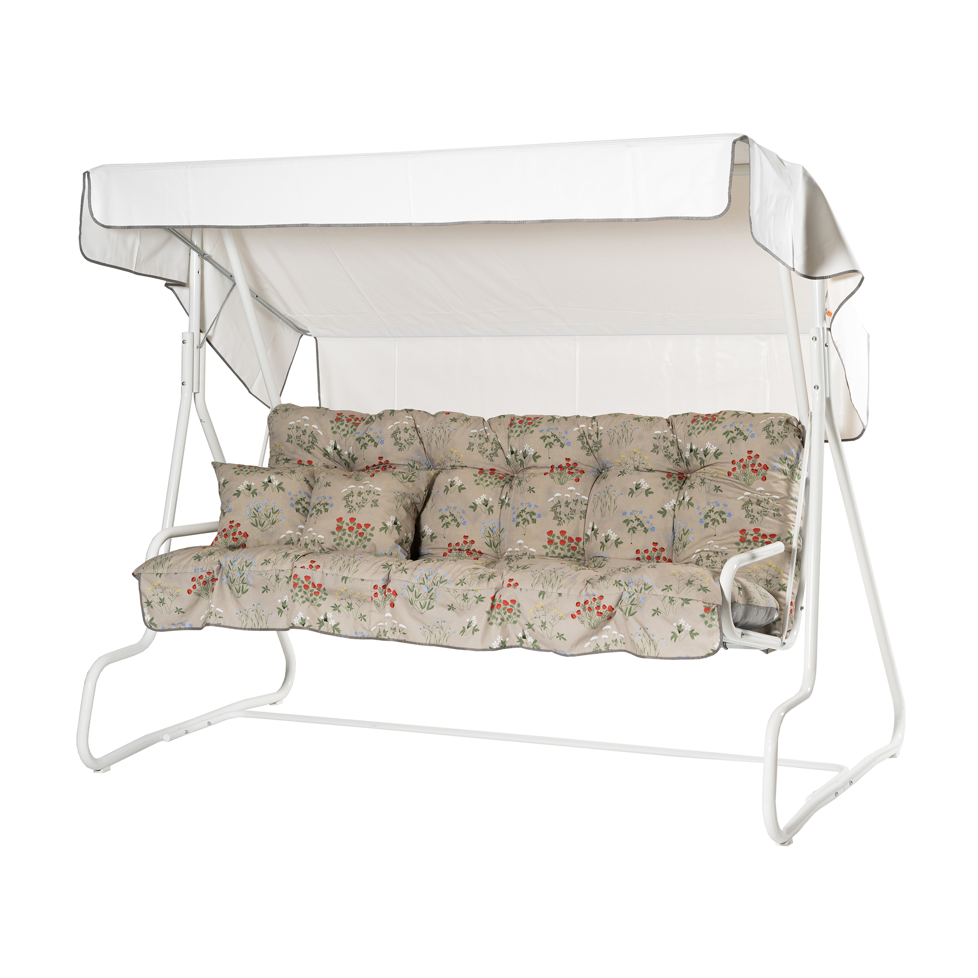 Hammock De Luxe 3-sits ifrån Varax är inbjudande med dynor, vit stomme och vitt tak.