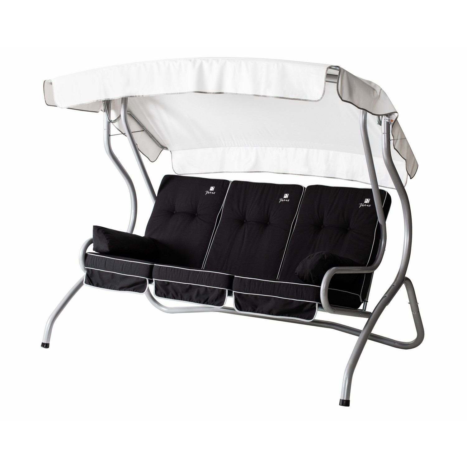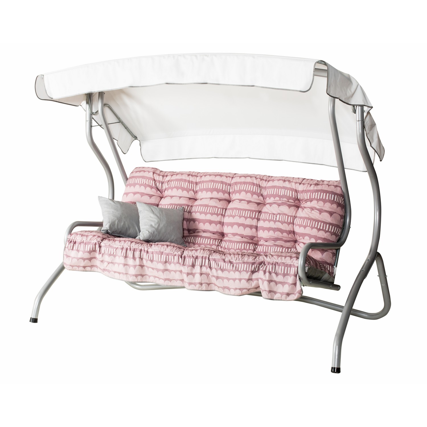 Hammock Monica 3-sits ifrån Varax är inbjudande med dynor, grå stomme och vitt tak.