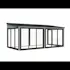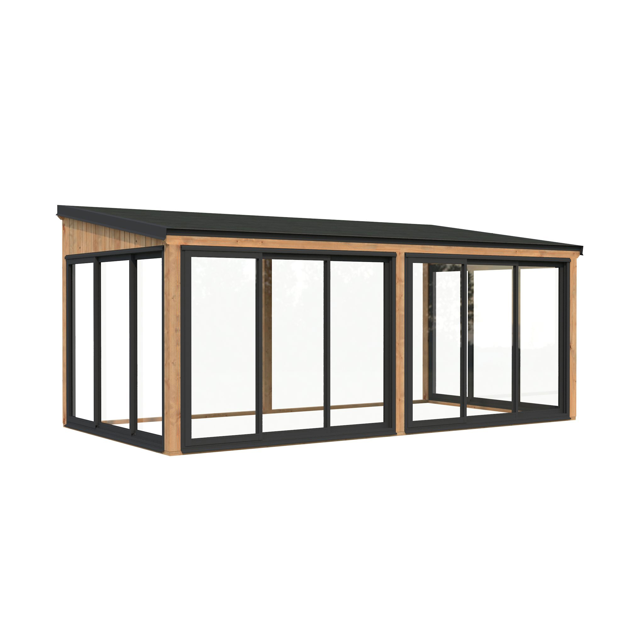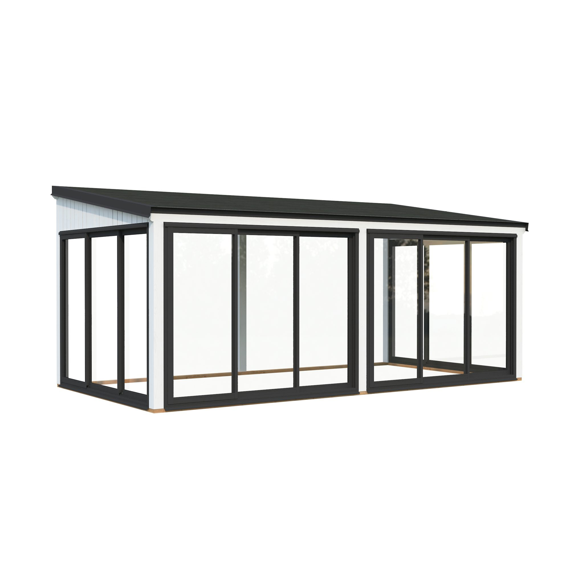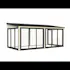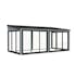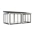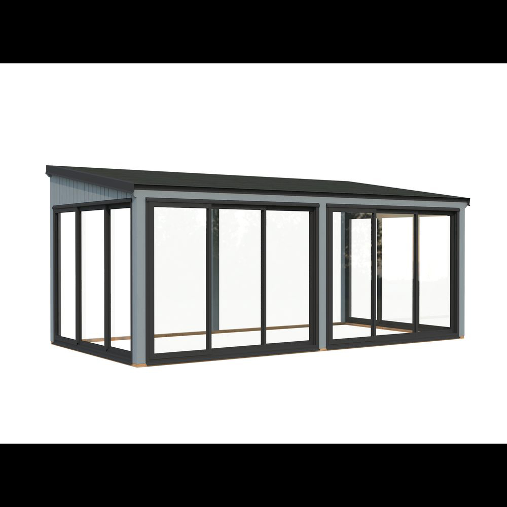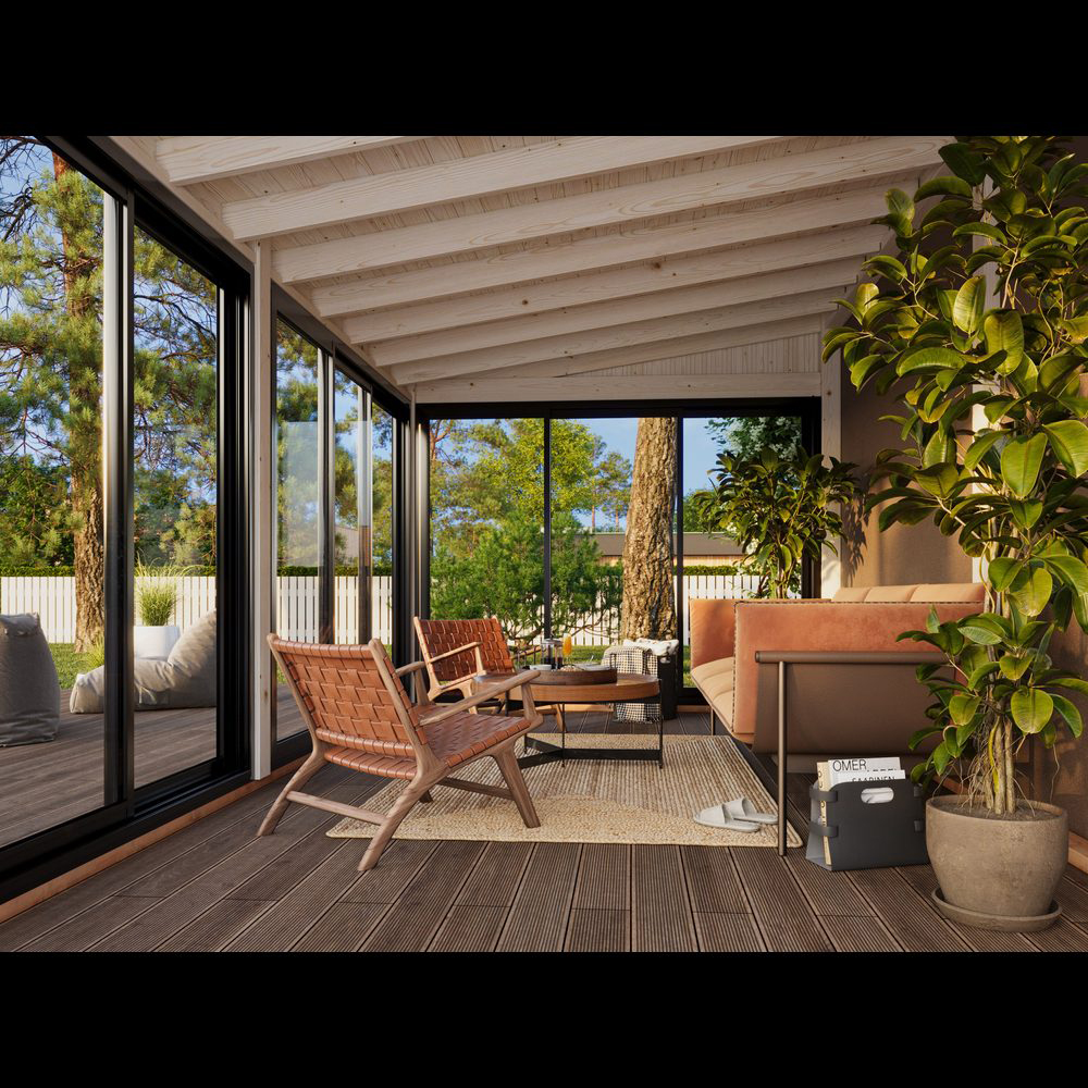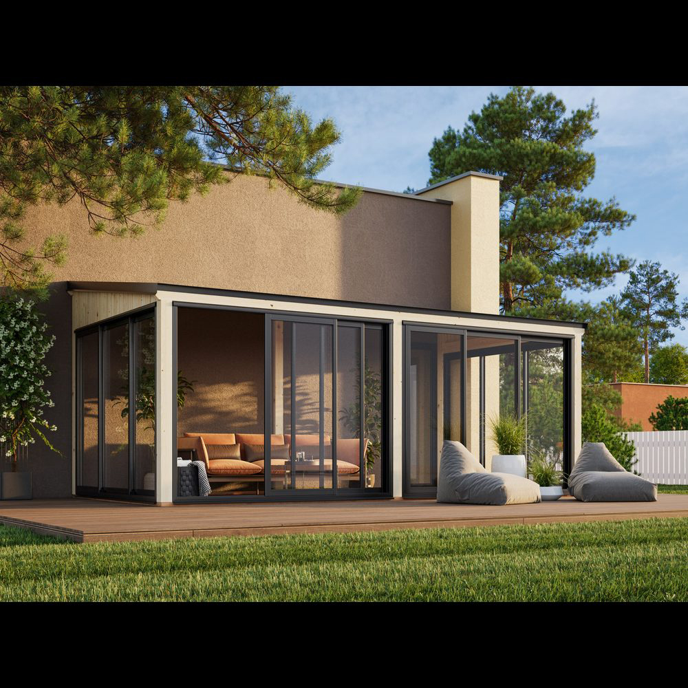 Lumi 16,2 m² Slide är ett modernt och mångsidigt uterum tillverkat av högkvalitativ nordisk gran och stöds av laminerade stolpar (120x120 mm) för långvarig stabilitet. Dess rena, platta tak och minimalistiska design gör det till ett stilrent inslag i moderna trädgårdar, på terrasser eller vid poolen.Paviljongen har aluminiumskjutdörrar med 4 mm härdat glas, vilket kombinerar säkerhet och elegant utseende. Dörrarna är låsbara för extra trygghet.