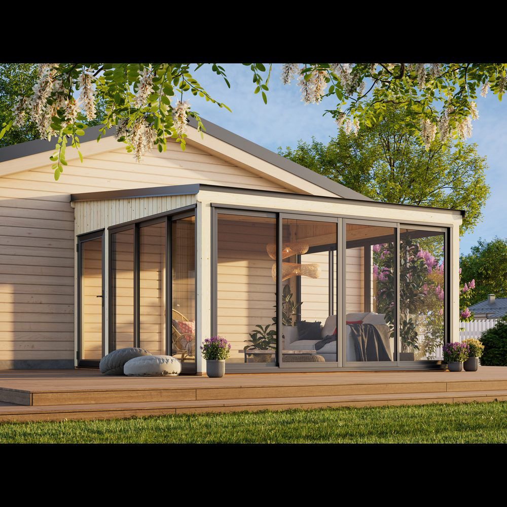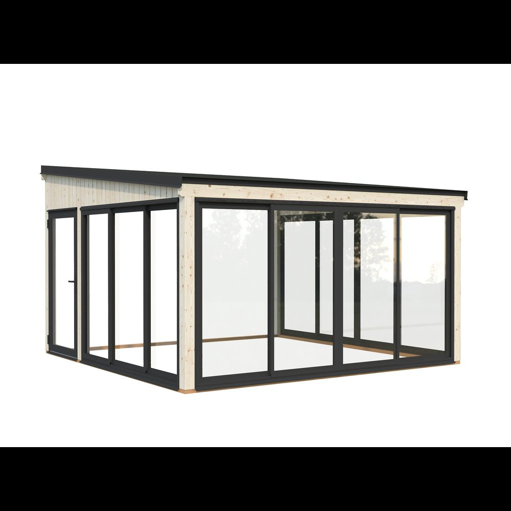 Lumi 16,6 m² Slide är ett modernt, mångsidigt uterum tillverkat av högkvalitativ nordisk gran, med laminerade stolpar (120x120 mm) för lång hållbarhet. Den rena, platta takdesignen och minimalistiska stilen gör det till ett elegant tillskott i moderna trädgårdar, på terrasser eller vid poolen.Paviljongen har aluminiumskjutdörrar och en enkel aluminiumdörr, båda med 4 mm härdat glas, vilket kombinerar säkerhet med stil. Skjutdörrarna är låsbara.