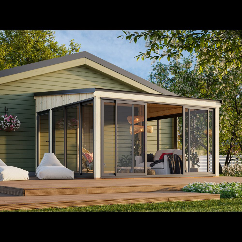 Elegant uterum i nordisk stil med trästomme och dubbelglasade aluminiumskjutdörrar. Lumi 16,6 m² Slide Plus är ett modernt, mångsidigt uterum tillverkat av högkvalitativ nordisk gran, med laminerade stolpar (120x120 mm) för lång hållbarhet. Den rena, platta takdesignen och minimalistiska stilen gör det till ett elegant tillskott i moderna trädgårdar, på terrasser eller vid poolen.Paviljongen har aluminiumskjutdörrar och en enkel aluminiumdörr, båda med 24 mm härdat dubbelglas, vilket ger både säkerhet och en tyst inomhusmiljö. Skjutdörrarna är låsbara.