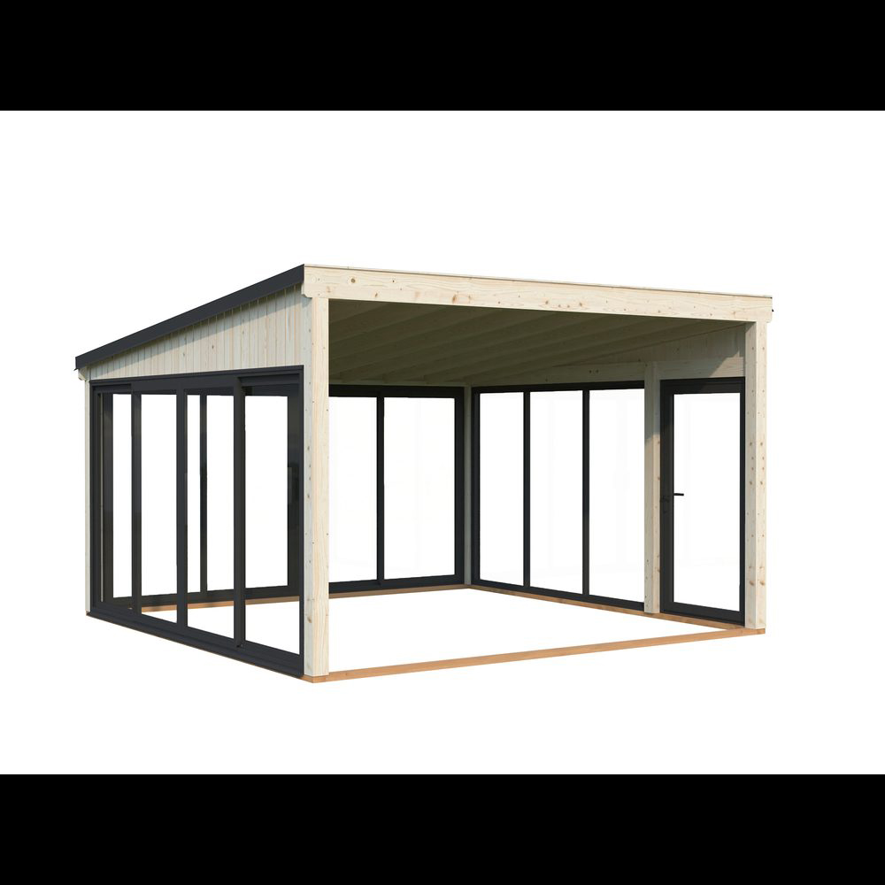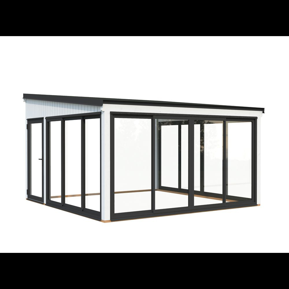 Med en yta på 16,6 m² erbjuder Lumi Slide Plus gott om utrymme för underhållning, avkoppling eller arbete hemifrån. Dörrarnas placering kan flyttas mellan sidoväggarna, vilket gör det enkelt att anpassa layouten efter din trädgård och dina behov.