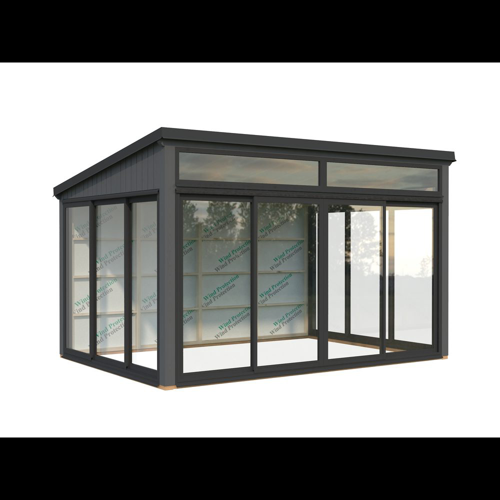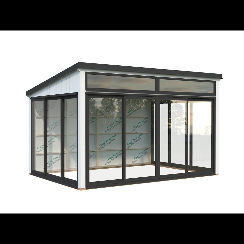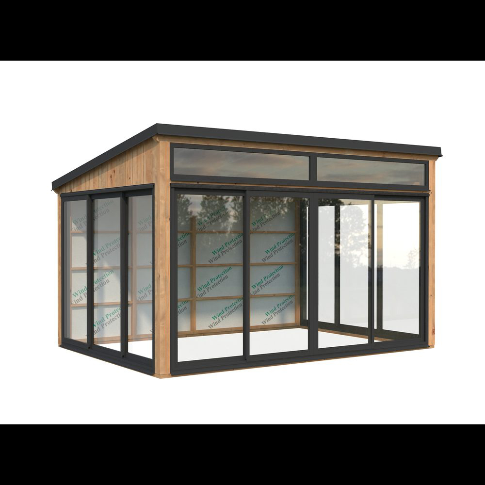 Elegant fristående uterum i nordisk stil i trä med dubbelglasade skjutdörrar i aluminium. Saga 11,6 m² Slide Plus är ett modernt och mångsidigt uterum, tillverkat av högkvalitativ nordisk gran och stöds av laminerade stolpar (120x120 mm) för långvarig hållbarhet. Den rena, platta takdesignen och minimalistiska stilen gör det till ett elegant tillskott i moderna trädgårdar, på terrasser eller vid poolen.Paviljongen har aluminiumskjutdörrar med 24 mm härdat dubbelglas, vilket ger säkerhet och reducerar ljudnivån inomhus. Skjutdörrarna är låsbara.