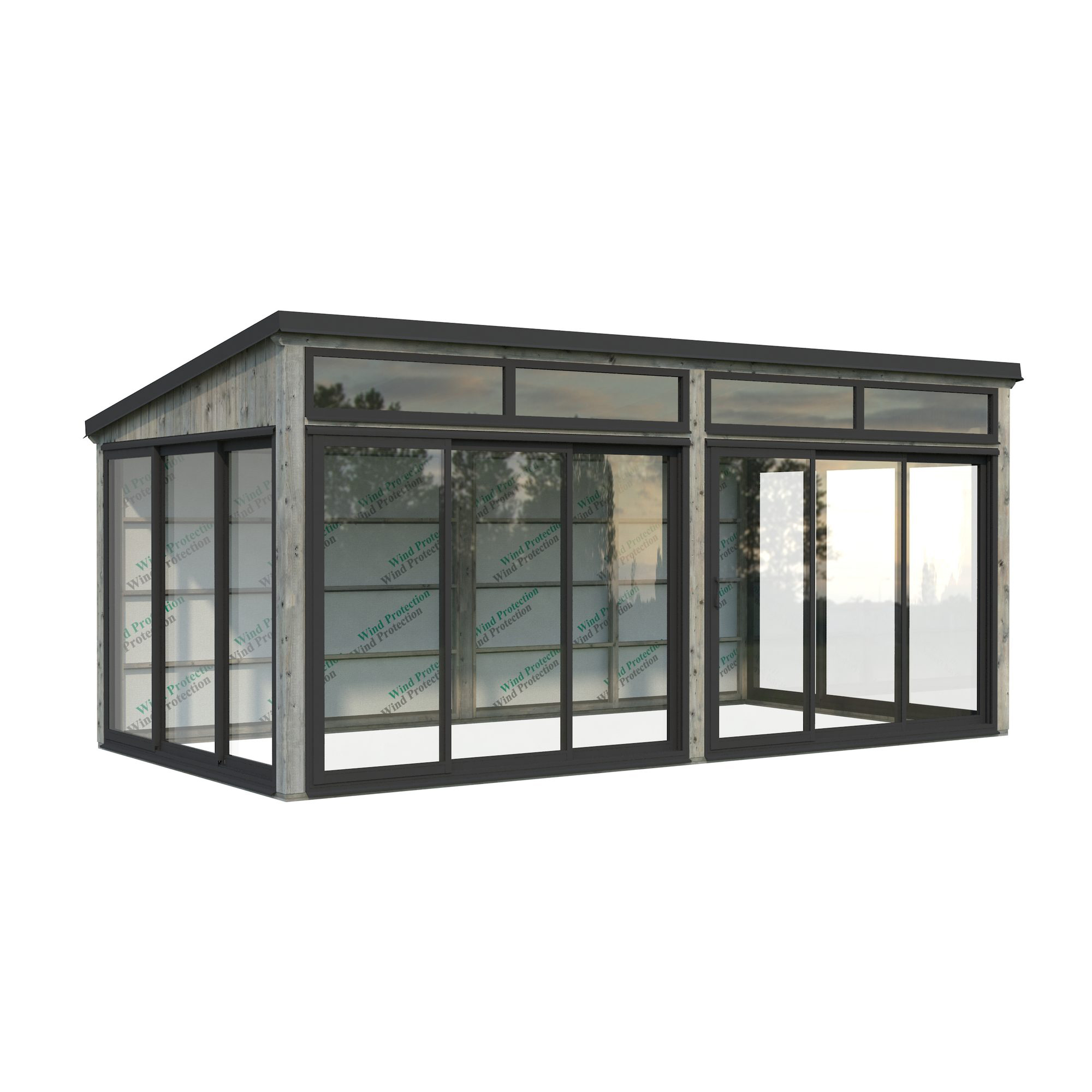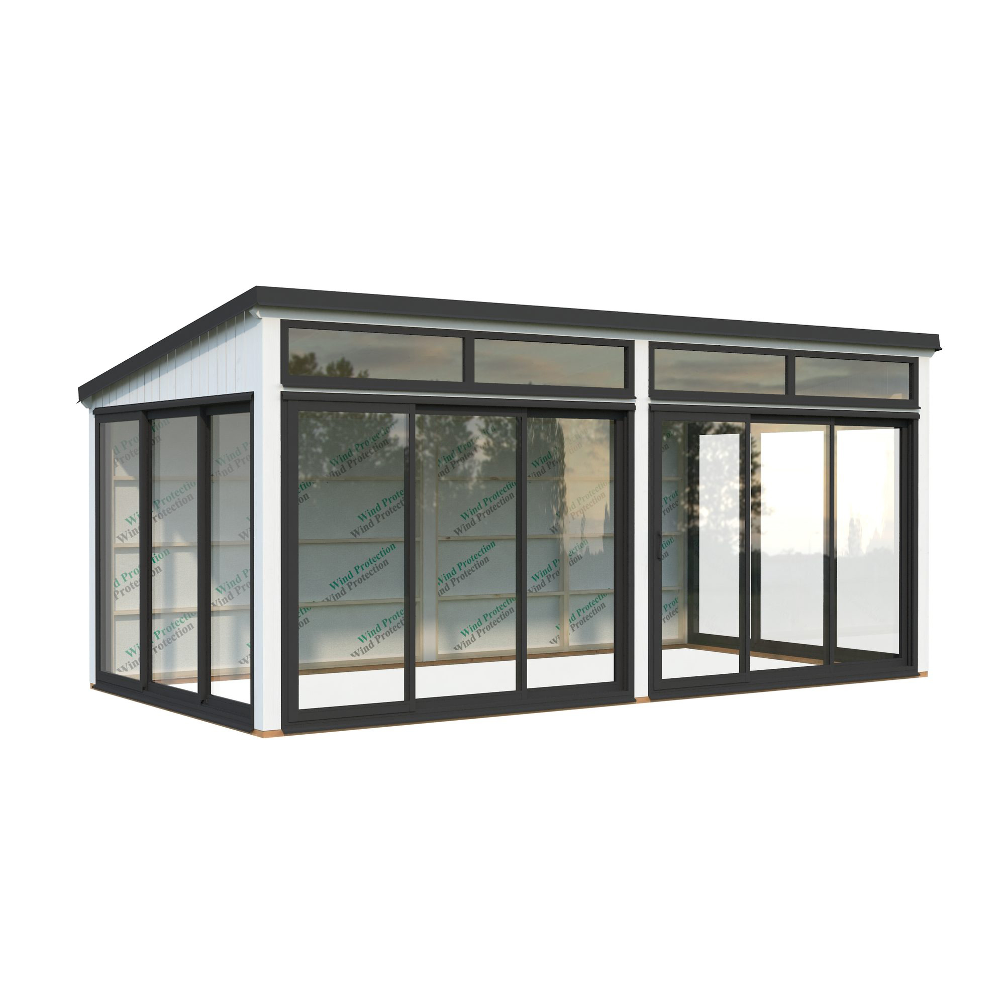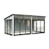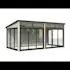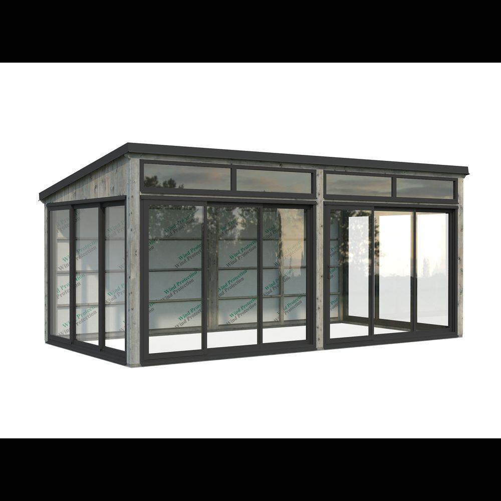 Elegant fristående uterum i nordisk stil i trä med dubbelglasade skjutdörrar i aluminium. Lumi 16,2 m² Slide Plus är ett modernt, mångsidigt uterum byggt av högkvalitativ nordisk gran och stöds av laminerade stolpar (120x120 mm) för långvarig hållbarhet. Den rena, platta takdesignen och minimalistiska stilen gör det till ett stilrent tillskott i moderna trädgårdar, på terrasser eller vid poolen.Paviljongen har aluminiumskjutdörrar med 24 mm härdat dubbelglas, vilket ger både säkerhet och extra ljudisolering. Skjutdörrarna är låsbara.