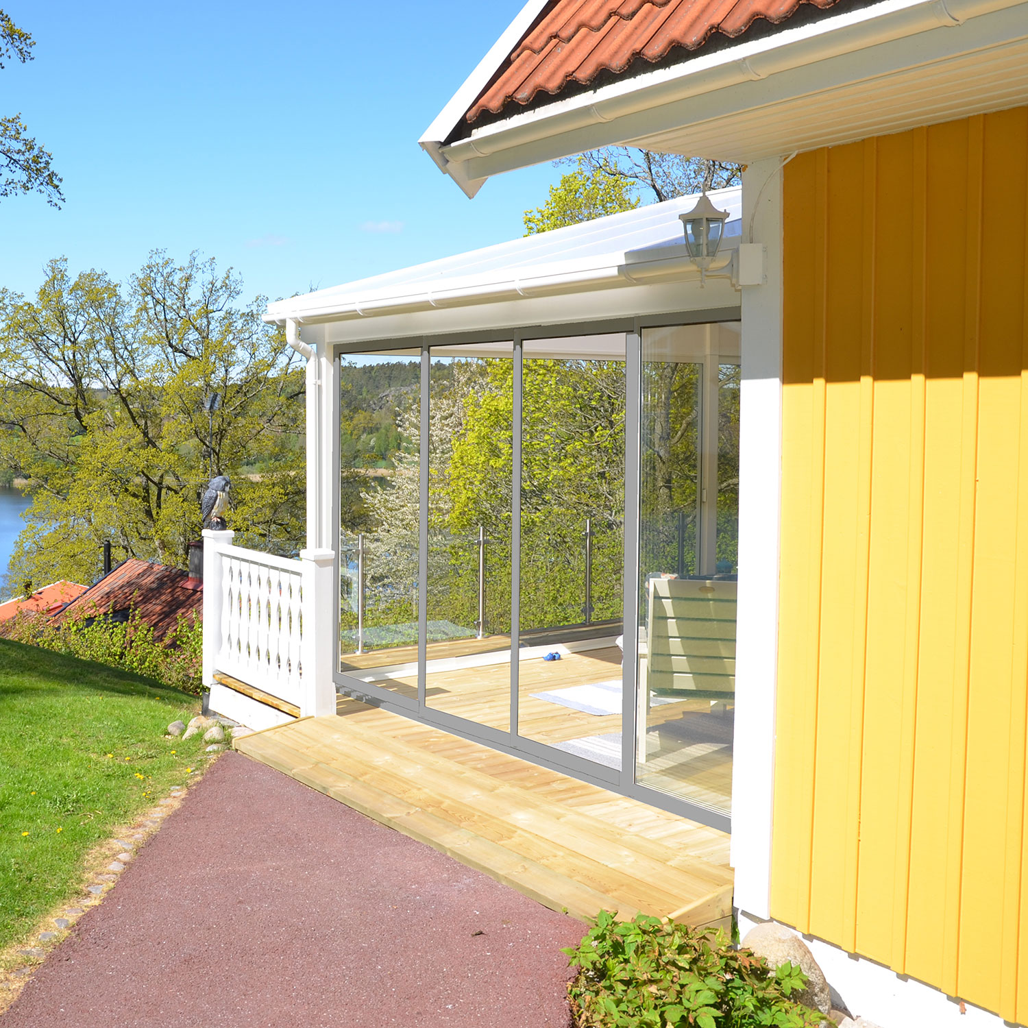 Uterumsparti Stadig från Landskap som passar uterum där du vill få ut det mesta av sommarsäsongen. Stadig Förlängd sommar har ett enkelglas med energibeläggning, vilket gör att du kan nyttja rummet något mer då värmen hålls kvar längre än vanligt glas. Den andra fördelen är att det minskar risken för imma och rimfrost på glaset. Med hela glas i luckorna känns naturen närmre och inget stör ögats blick ut i trädgården. Tillsammans med ett kanalplasttak får du ett uterum som är ljust och ger dig många härliga dagar.