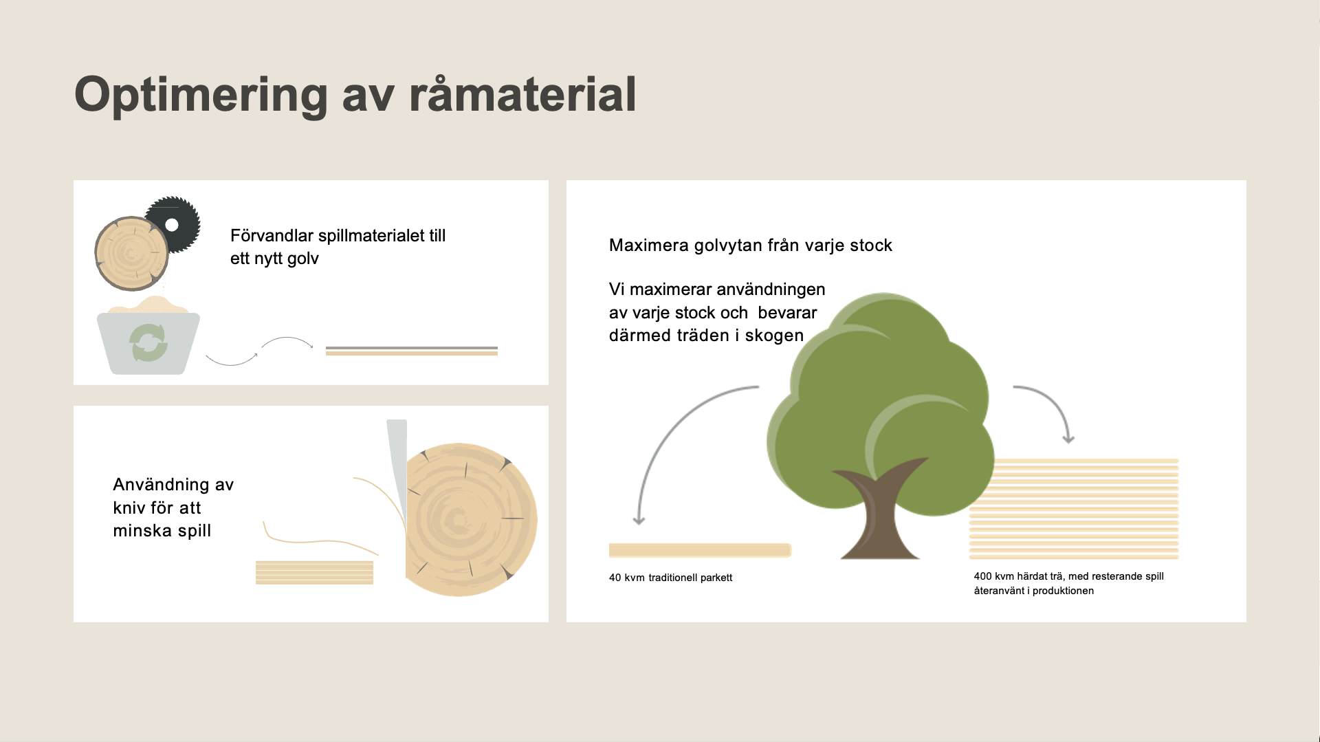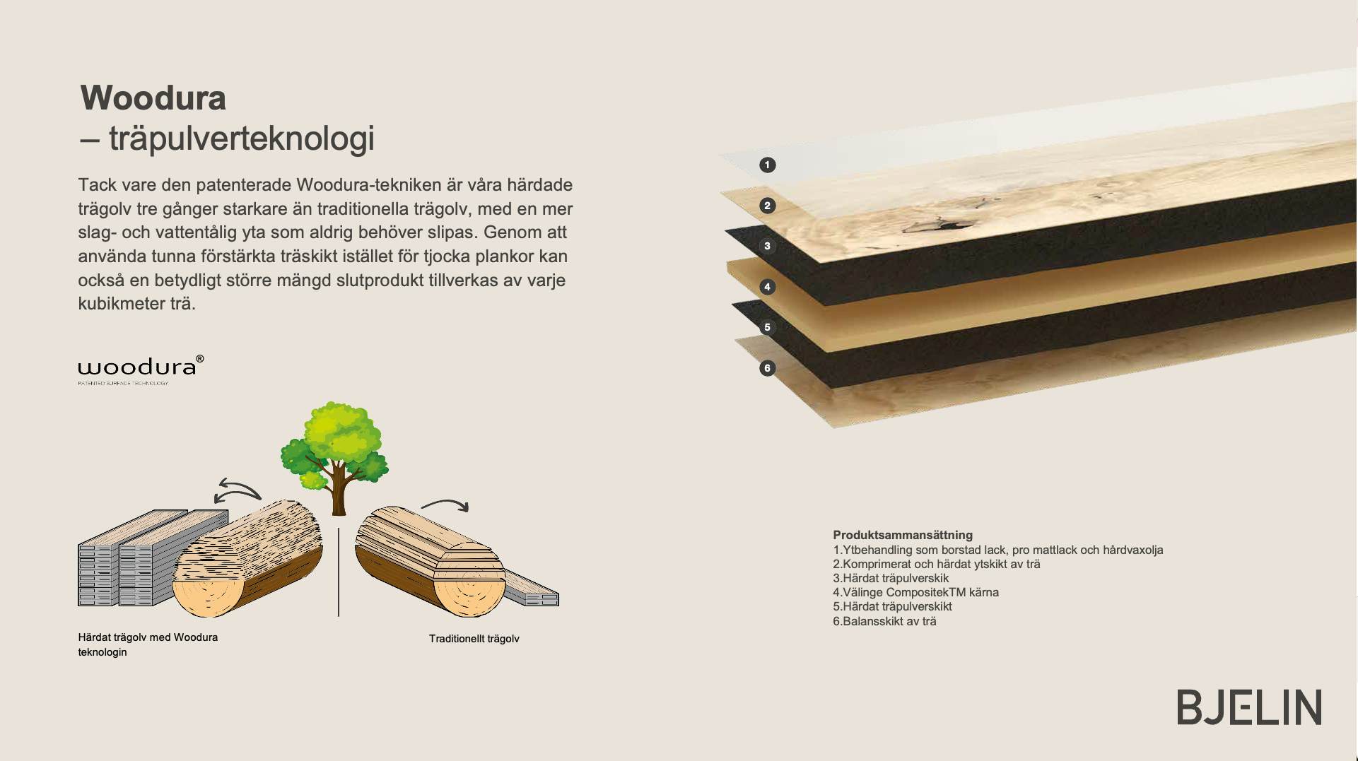 Woodura-tekniken möjliggör användning av tunnare ytskikt och hela trädet som råvara, vilket resulterar i tio gånger fler golv från samma stock och en yta som aldrig behöver slipas om. De härdade trägolven har tre gånger högre slaghållfasthet än traditionella ekgolv, snabb installation, effektiv råvaruanvändning och är klassificerade för offentlig miljö, Klass 33. Golven produceras miljövänligt och har ett vattentåligt klicksystem, 5G Dry.