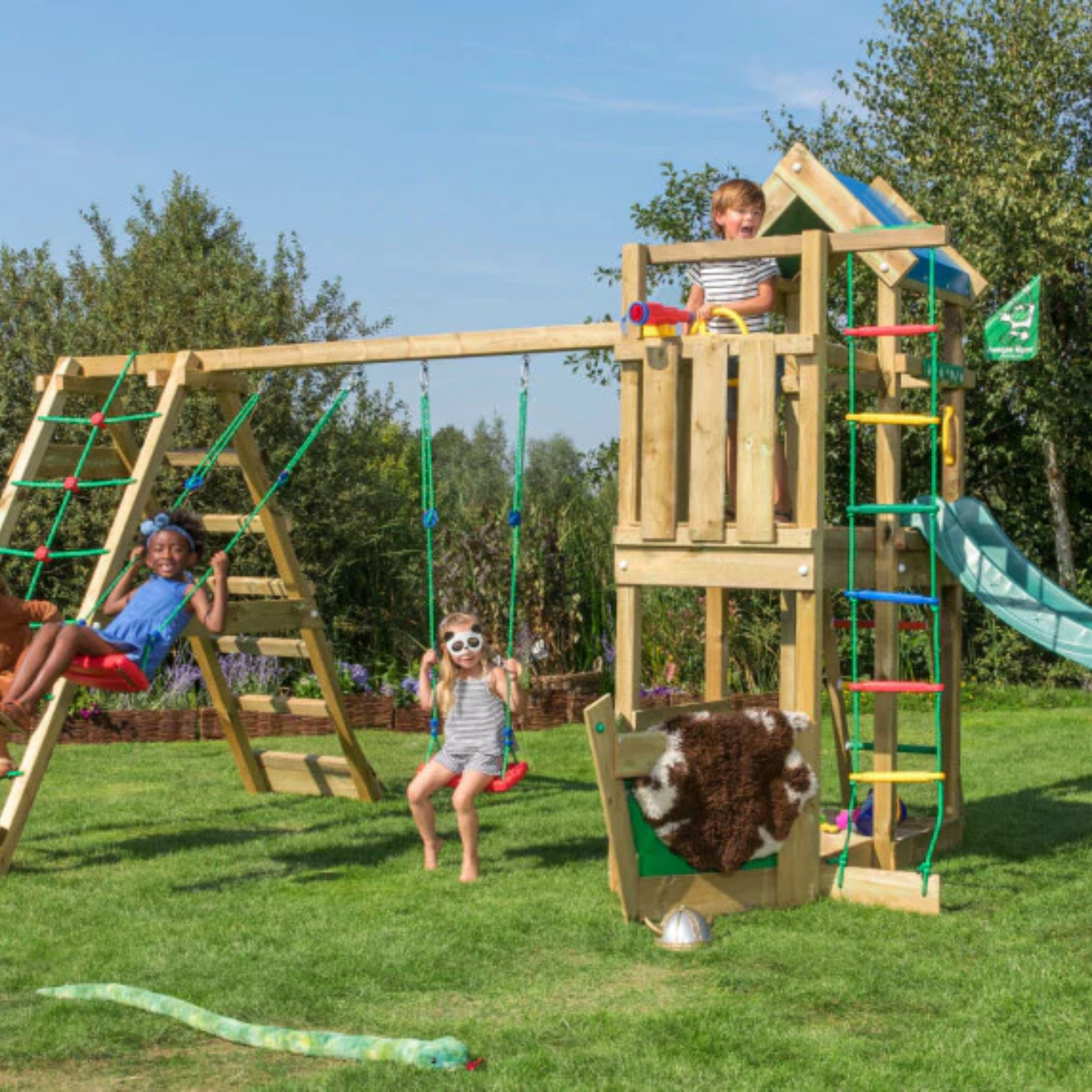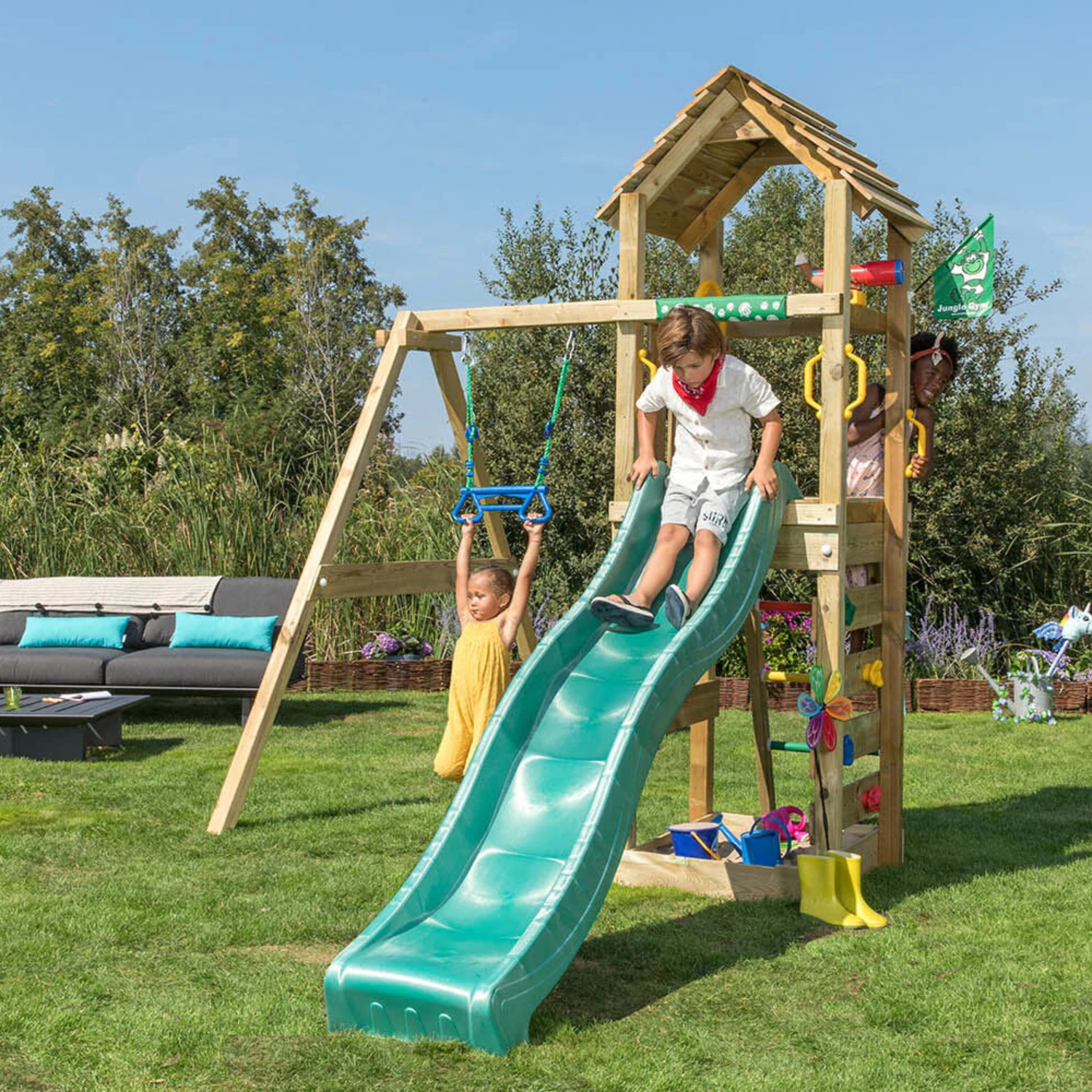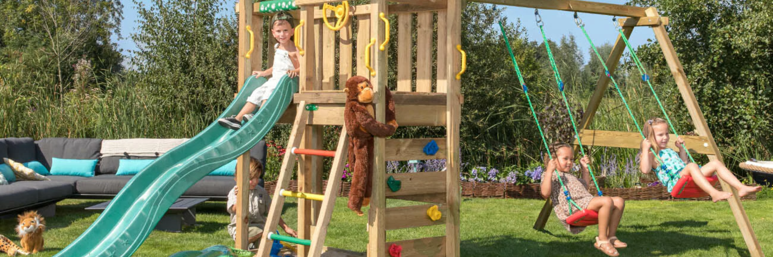 Jungle Gym är ett holländskt företag som är experter på lekplatser utomhus. De har funnits i ca 25 år och har ända från start velat aktivera barn på ett professionellt sätt och har många glada användare. Barn gillar att klättra och utforska saker. Så tryggt och bra att kunna göra det på sin gräsmatta med en egen lekplats. Jungle Gym har säkra kvalitetsprodukter som exempelvis klätterställning och klätternät, lekstuga eller gungställning. Lekplatsen kräver lågt underhåll och håller länge.